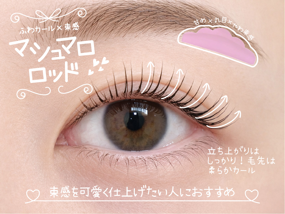 マシュマロ: 根元に少し丸みを持たせてから上げる = 長く見せつつ、柔らかく優しい・マスカラが塗りやすい